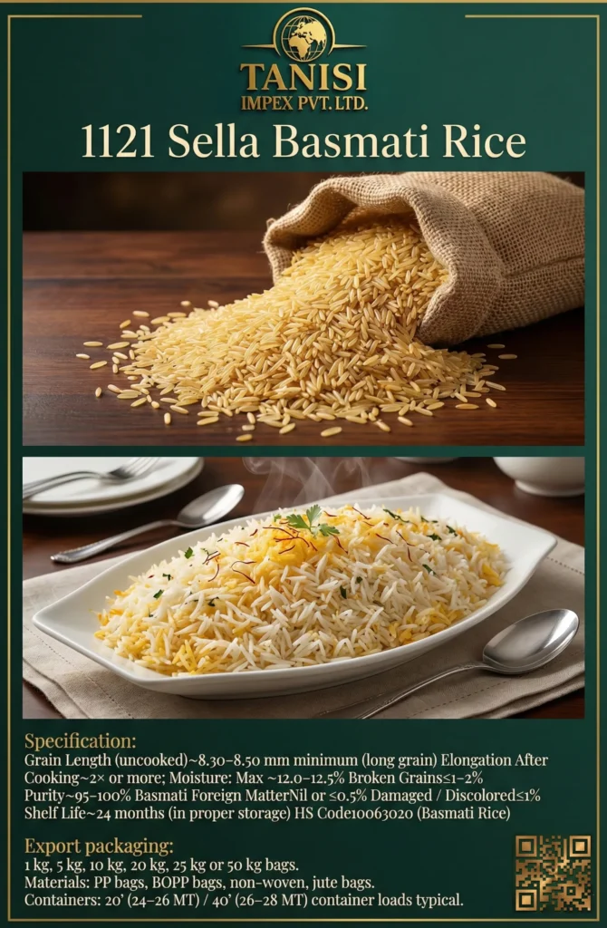 Basmati Rice 1121 Sella is a parboiled long-grain rice known for its extra-long kernels, excellent elongation on cooking, and nutty aroma. It is widely used in Biryani, Pulao, and premium restaurant preparations, as well as in packaged retail and bulk exports.